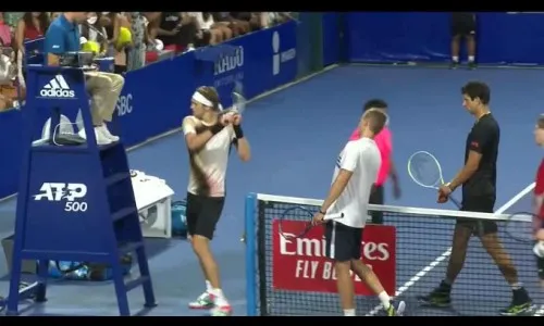 व्हेरेव्ह व त्याचा साथीदार मार्सेलो मेलो दुहेरीच्या सामन्यात टायब्रेकमध्ये लॉईड ग्लासपूल व हॅरी हेलिओव्हारा यांच्याकडून 6-2, 4-6, 10-6 असे पराभूत झाल्यानंतर व्हेरेव्हने रागाने पंचांच्या खुर्चीला रॅकेट अनेकदा जोरात मारली आणि पंच अलेसांड्रो जर्मनी यांनाही तो मारण्याच्या बेतात होता. या सामन्यावेळी एका लाईनकॉलवरून व्हेरेव्ह चिडला होता. त्या रागाने त्याच्याकडून सामन्यानंतर हे अखिलाडू वर्तन घडले. यामुळे आयोजन समितीने व्हेरेव्हची या स्पर्धेतून हकालपट्टी करण्याचा निर्णय घेतला. एकेरीच्या पहिल्या फेरीत व्हेरेव्हने दुसऱया सेटमध्ये दोन मॅचपॉईंट वाचवत 3-6, 7-6 (12-10), 6-2 असा विजय मिळवित दुसरी फेरी गाठली होती. त्याची पुढील लढत त्याचाच देशवासी पीटर गोजोवझीकशी होणार होती. पण पीटरला आता पुढे चाल मिळाल्याने तो उपांत्यपूर्व फेरीत पोहोचला आहे. व्हेरेव्ह या स्पर्धेचा विद्यमान विजेता होता.
