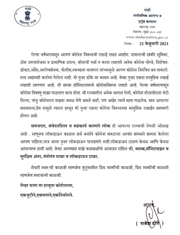 ते आपल्या पत्रात म्हणाले की, गेल्या वर्षभरापासून आपण कोरोनाविरुद्धची लढाई लढत आहोत. शासनाची खंबीर भूमिका, ठोस उपाययोजना आणि प्रामाणिक प्रयत्न, जीवाची पर्वा न करता लढणारे अनेक कोरोना योद्धे, विशेषतः डॉक्टर, नर्सेस, आरोग्य सेवक, पोलीस, स्वच्छता कामगार यांच्यामुळे आपण कोरोना नियंत्रित करू शकलो. मात्र, अद्यापही कोरोना गेलेला नाही. तो पुन्हा डोकं वर काढतोय. तेव्हा पुन्हा एकदा सामूहिक लढाई लढावी लागणार आहे. मी सध्या हॉस्पिटलमध्ये कोरोनाविरुद्ध लढतोय. गेल्या वर्षभरापासून विषाणू माझा पाठलाग करत होता. मी राज्यातील अनेक भागात गेलो. कोरोना हॉटस्पॉटला भेटी दिल्या. परंतु कोरोनाला माझ्याजवळ येणे जमले नाही, पण अखेर त्याने मला गाठलेच. मात्र आपल्या सद्बावना, प्रेम यामुळे त्याला हरवून मी पुन्हा एकदा करोना विरुद्धच्या सामूहिक लढातईत सहभागी होणार आहे, असे टोपे यांनी म्हटले आहे.