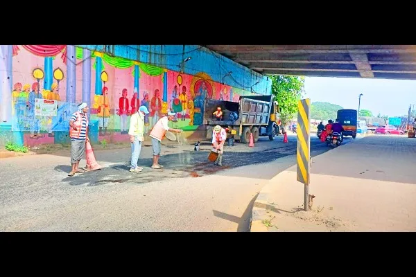 ही तर केवळ मलमपट्टी गांधीनगर येथील ब्रिजखाली मागील अनेक दिवसांपासून ख•s पडले होते. शनिवारी सकाळी हे खड्डे भरण्याचे काम केले. केवळ खडी टाकून त्यावर डांबराचा शिडकावा करण्याचा प्रयत्न केला जात असल्याने नागरिकांमधून संताप व्यक्त होत आहे. हा दिखाऊपणा केवळ अधिवेशनासाठीच का? असा प्रश्न उपस्थित होत आहे.