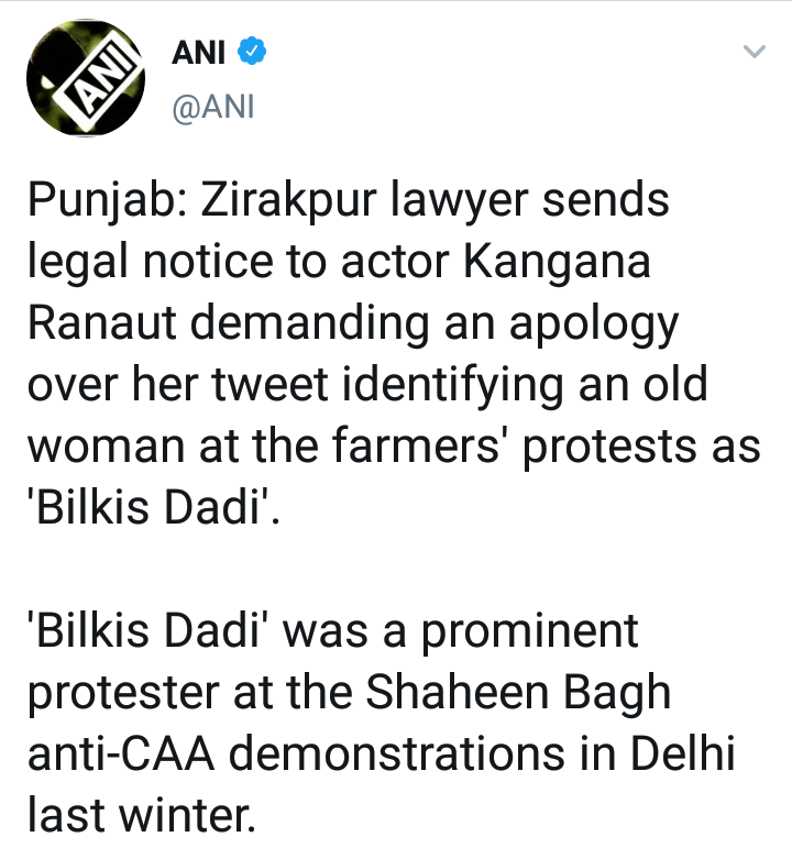 आंदोलन करणारी महिला ही बिलकीस बानो नसून, दुसरीच कोणीतरी आहे, हे लक्षात आल्यावर कंगनाने तिचे ट्विट डिलीटदेखील केले. परंतु, आता तिने या आजीची 7 दिवसांत माफी मागावी, अशी कायदेशीर नोटीस तिला पाठवण्यात आली आहे.
