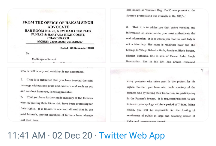 या टीकेनंतर आता कंगनाने माफी मागावी, अशी मागणी सुरू आहे. तर, पंजाब आणि हरियाणाच्या हायकोर्टातील चंडीगड स्थित जेष्ठ वकील आणि सामाजिक कार्यकर्ते हाकम सिंह यांनी कंगनाला कायदेशीर नोटीस पाठवली आहे.