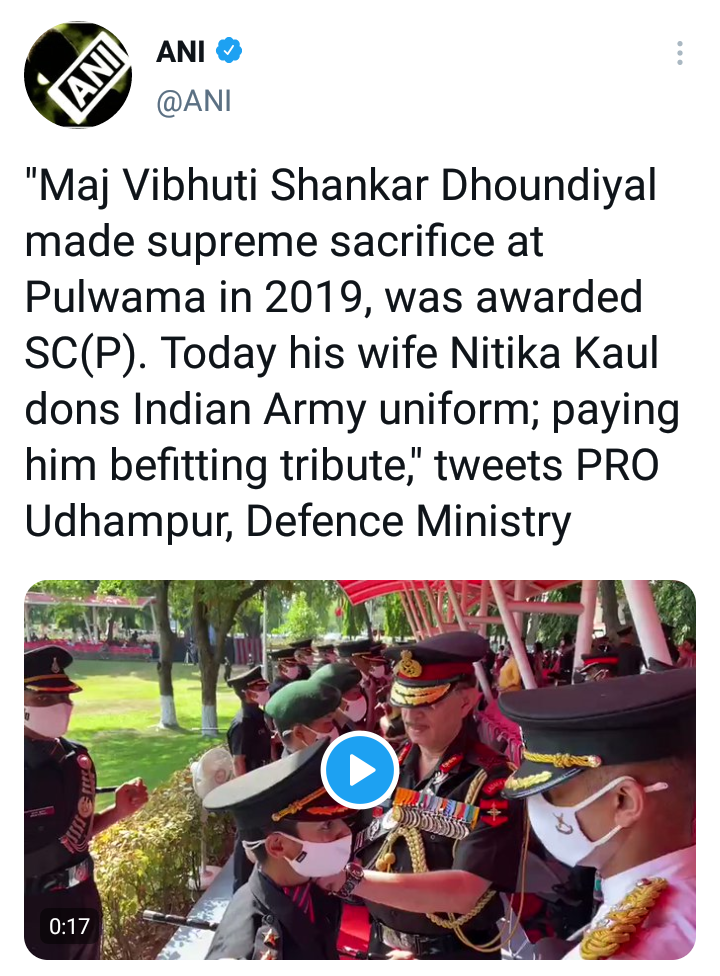 2019 साली पुलवामात सर्वोच्च बलिदान देणाऱ्या मेजर विभूती शंकर धौंडियाल यांना मरणोत्तर शौर्य चक्र पुरस्कार देऊन सन्मानित करण्यात आले होते. आज त्यांची पत्नी निकिता कौल यांना सेनेची गणवेशत परिधान करत आपल्या पतीला सर्वश्रेष्ठ श्रद्धांजली अर्पण केली. हा त्यांच्यासाठी निश्चितच एक अभिमानाचा क्षण आहे, लष्कर कमांडर लेफ्टनंट वाय के जोशी यांनी त्यांच्या खांद्यावर स्टार चढवले, असे ट्विट करण्यात आले आहे.