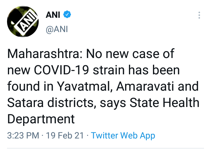 आतापर्यंत अमरावती, यवतमाळ, सातारा या भागातील प्रत्येकी चार नमुने पुणे येथील बी जे वैद्यकीय महाविद्यालयामध्ये तपासण्यात आले असून या नमुन्यांच्या तपासणी अहवालानुसार या जिल्ह्यांमधील विषाणूमध्ये ब्रिटन,दक्षिण आफ्रिका किंवा ब्राझील या देशांमध्ये आढळलेल्या नवीन विषाणू प्रकारासारखा कोणताही बदल दिसून आलेला नाही.