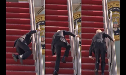 अमेरिकेचे अध्यक्ष जो बायडेन यांची एक चित्रफित समोर आली असून यात ते स्वतःचे विमान एअरफोर्स वनच्या पायऱयात चढताना 3 वेळा पडल्याचे दिसून येते. सुदैवाने त्यांना या सर्व प्रकारादरम्यान कुठलीच ईजा झालेली नाही. हा सर्व प्रकार शुक्रवारी घडला आहे.