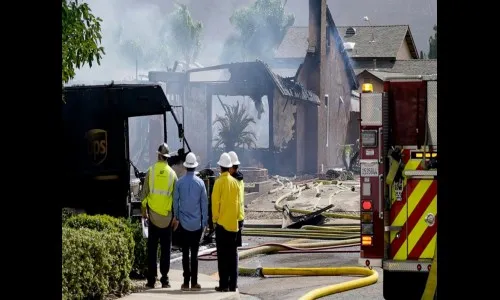 अमेरिकेच्या कॅलिफोर्निया प्रांतात सोमवारी एक छोटे विमान नागरी भागात कोसळले आहे. हे विमान दोन घरांवर कोसळले आणि स्फोटानंतर तेथे आग लागली आहे. एका डिलिव्हरी ट्रकसमवेत अनेक वाहने या स्फोटाच्या भक्ष्यस्थानी सापडली आहेत. या दुर्घटनेत 2 जणांचा मृत्यू झाला असून 4 जण जखमी झाले आहेत. तर 10 घरांचे मोठे नुकसान झाले आहे.