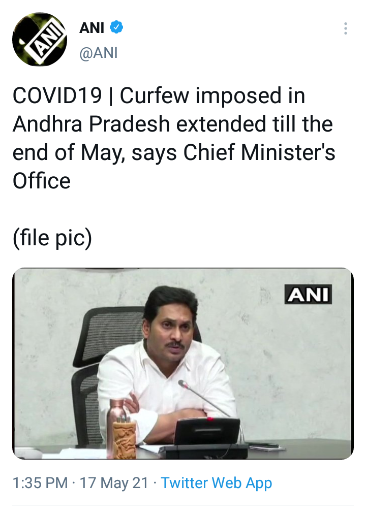 कोरोनाचा वाढता प्रादुर्भाव लक्षात घेत आंध्र प्रदेश सरकारने राज्यात सुरू असलेला कोरोना कर्फ्यू 31 मे पर्यंत वाढविण्यात आला आहे. मुख्यमंत्र्यांच्या उपस्थितीत कोरो ना परिस्थीतीचा आढावा घेण्यासाठी आज एक बैठक घेण्यात आली होती. या बैठकीत लॉकडाऊन वाढविण्याचा निर्णय घेण्यात आला. याबाबतची मुख्यमंत्री कार्यालयाने एक ट्विट करत माहिती दिली.
