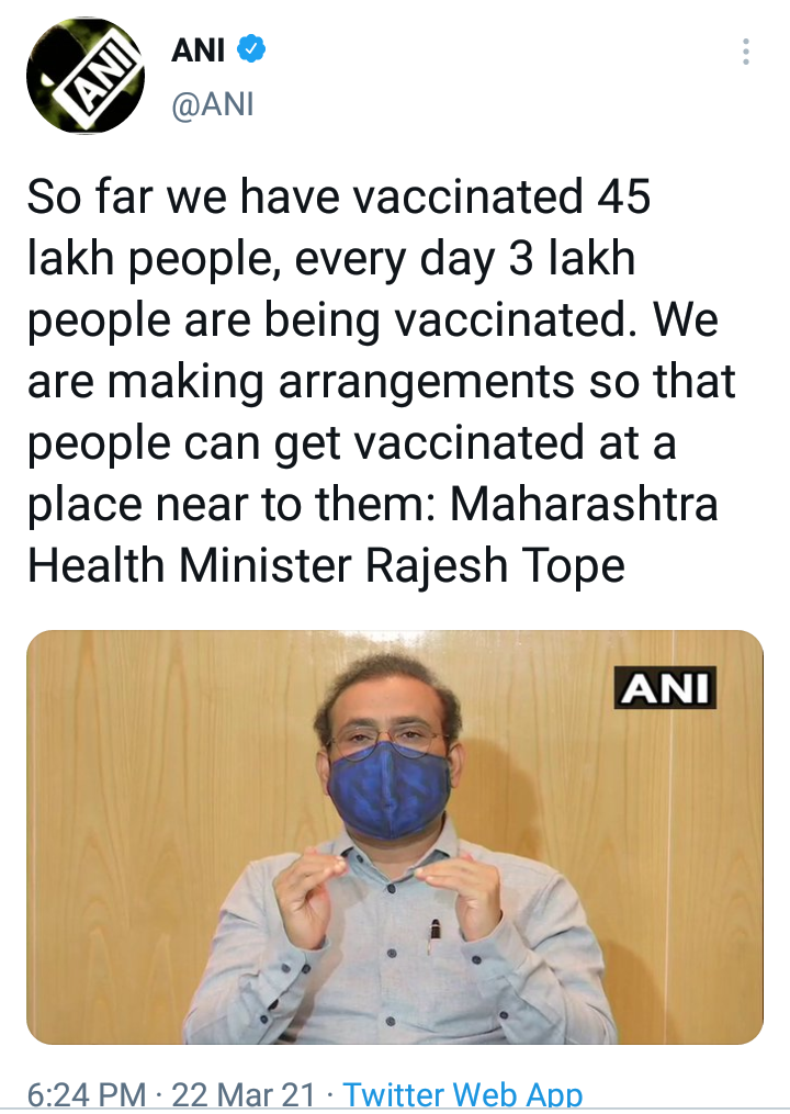 ते म्हणाले, राज्यात दररोज 3 लाख लोकांचे लसीकरण केले जात आहे. लसीकरणासाठी खासगी ठिकाणे वाढवली जात आहेत. त्याचबरोबर ग्रामीण भागात उपकेंद्रापर्यंत लसीकरणाच्या दृष्टीने लोकांना सुलभता व्हावी, यासाठी आम्ही व्यवस्था केली जात आहे.
