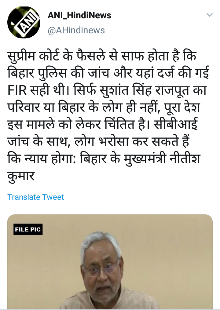अभिनेता सुशांतसिंह राजपूत प्रकरणात सीबीआय चौकशीला सुप्रीम कोर्टाने मान्यता दिली आहे. त्या निर्णयानंतर सगळ्याच क्षेत्रातून प्रतिक्रिया येत आहेत. यावर बिहारचे मुख्यमंत्री नितीश कुमार यांची देखील प्रतिक्रिया दिली आहे.