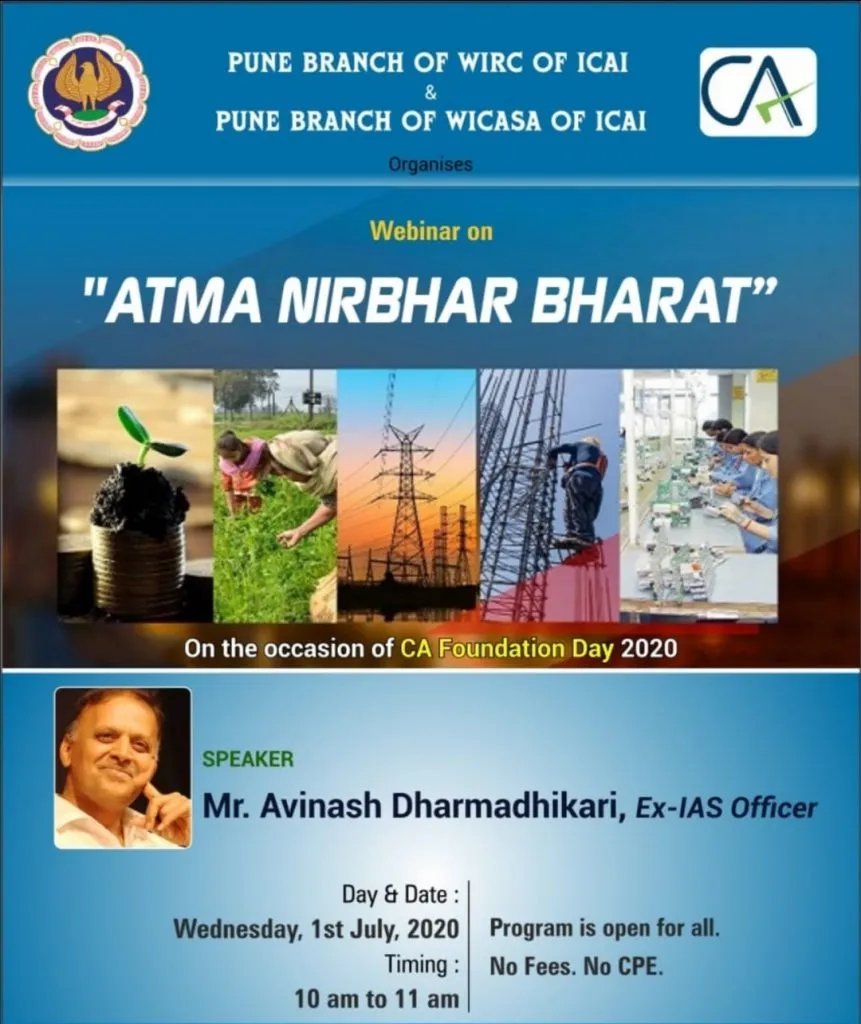 दि इन्स्टिट्यूट ऑफ चार्टर्ड अकाऊंटंट्स ऑफ इंडिया (आयसीएआय) पुणे शाखा आणि वेस्टर्न इंडिया चार्टर्ड अकाऊंटंट स्टुडंट्स असोसिएशन (विकासा) पुणे शाखा यांच्या संयुक्त विद्यमाने सीए स्थापना दिवसाच्या निमित्त हे व्याख्यान होणार आहे. आज (बुधवार) सकाळी १० ते ११ या वेळेत अविनाश धर्माधिकारी मार्गदर्शन करणार आहेत. हा कार्यक्रम www.youtube.com/puneicaiofficial यावरुन लाईव्ह प्रसारित होणार आहे, अशी माहिती ‘आयसीएआय’चे अध्यक्ष सीए अभिषेक धामणे यांनी दिली. हा कार्यक्रम सर्वांसाठी विनामूल्य आहे. पंतप्रधान नरेंद्र मोदी यांनी आवाहन केल्याप्रमाणे ‘आत्मनिर्भर भारत’ कसा घडवायचा, तसेच आत्मनिर्भर व्हायचे म्हणजे नेमके काय करायचे आदींबाबत धर्माधिकारी आपल्या विवेचनात मांडणार असल्याचे धामणे यांनी कळविले आहे.