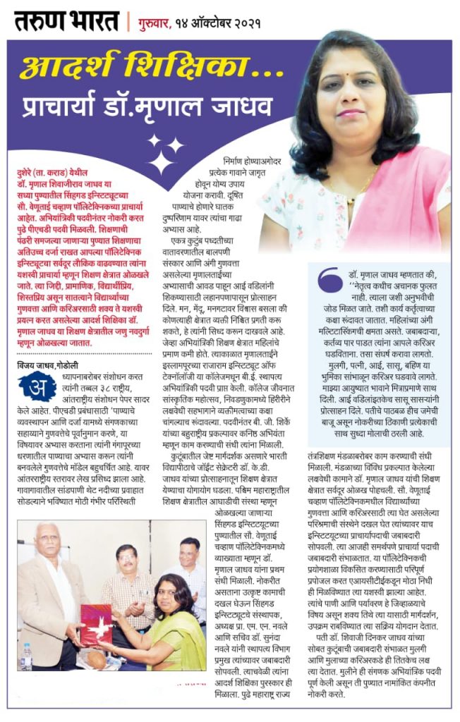 दुशेरे (ता. कराड) येथील डॉ. मृणाल शिवाजीराव जाधव या सध्या पुण्यातील सिंहगड इन्स्टिटय़ूटच्या सौ. वेणूताई चव्हाण पॉलिटेक्निकच्या प्राचार्या आहेत. अभियांत्रिकी पदवीनंतर नोकरी करत पुढे पीएचडी पदवी मिळवली. शिक्षणाची पंढरी समजल्या जाणाऱ्या पुण्यात शिक्षणाचा अतिउच्च दर्जा राखत आपल्या पॉलिटेक्निक इन्स्टिय़ूटचा सर्वदूर लौकिक वाढवण्यात त्यांना यशस्वी प्राचार्या म्हणून शिक्षण क्षेत्रात ओळखले जाते. त्या जिद्दी, प्रामाणिक, विद्यार्थीप्रिय, शिस्तप्रिय असून सातत्याने विद्यार्थ्यांच्या गुणवत्ता आणि करिअरसाठी शक्य ते यशस्वी प्रयत्न करत असलेल्या आदर्श शिक्षिका डॉ. मृणाल जाधव या शिक्षण क्षेत्रातील जणु नवदुर्गा म्हणून ओळखल्या जातात.