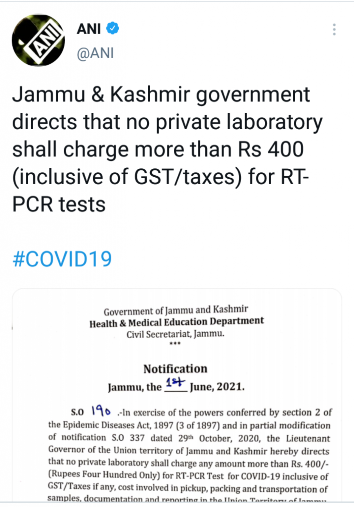 जम्मू काश्मीर सरकारने आरटी-पीसीआर टेस्ट संदर्भात एक मोठा निर्णय घेतला आहे. सरकारने निर्देश दिले आहेत की, राज्यातील कोणतीही खाजगी प्रयोगशाळा आता आरटी-पीसीआर टेस्टसाठी 400 रूपयांपेक्षा अधिक रक्कम आकारू शकणार नाही.