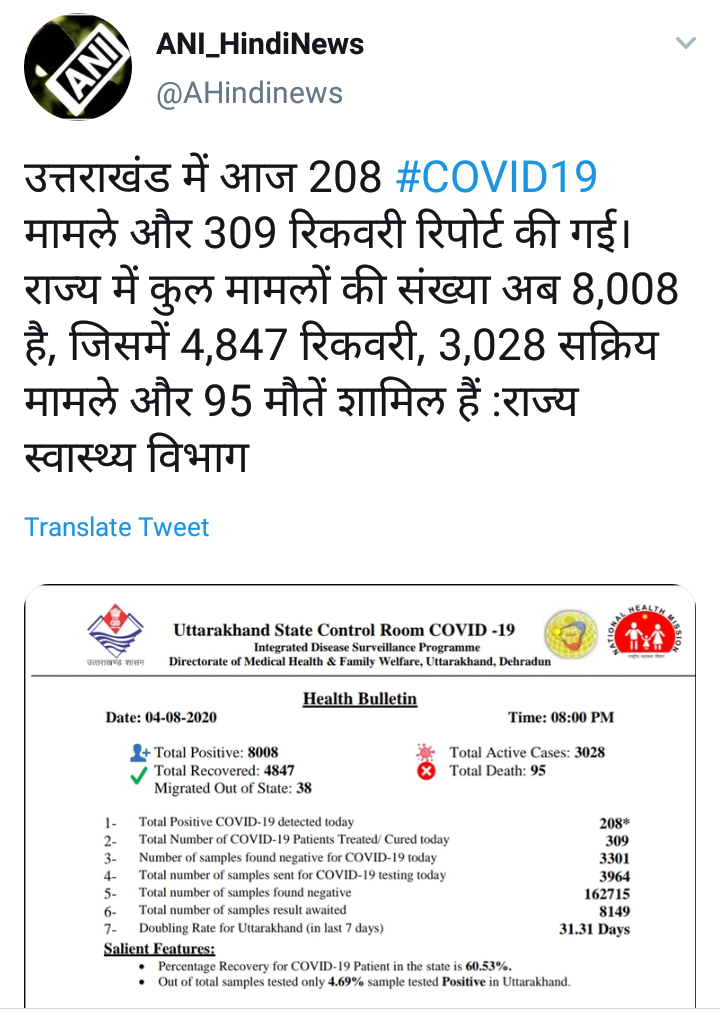 दरम्यान, उत्तराखंड राज्यातील एकूण 8008 रुग्णांपैकी आतापर्यंत 4847 रुग्णांची प्रकृती सुधारली असून त्यांना घरी सोडण्यात आले आहे. रुग्ण बरे होण्याचे प्रमाण 60.63 टक्के इतके आहे. तर सध्या 3028 रुग्णांवर विविध रुग्णालयात उपचार सुरू आहेत, तर आतापर्यंत 95 रुग्णांचा मृत्यू झाला आहे, असे पंत यांनी यावेळी स्पष्ट केले.