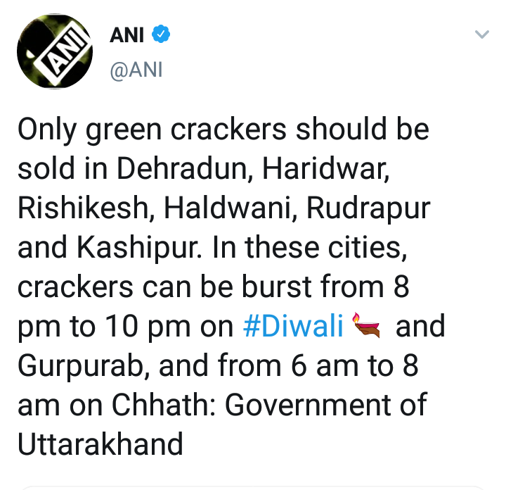 तसेच नियमांचे उल्लंघन केल्यास कारवाई केली जाईल, असा इशारा देखील देण्यात आला आहे. नवीन नियमावलीनुसार राज्याची राजधानी देहरादून, हरिद्वार, ऋषिकेश, रुद्रपुर, काशीपुर आणि हल्द्वानी शहरात केवळ ग्रीन फटाके लावता येणार आहेत. दिवाळी आणि गुरुपर्वच्या दिवशी रात्री 8 ते 10 या वेळेत आणि छटपूजेच्या दिवशी सकाळी 6 ते 8 या काळात केवळ दोन तास फटाके उडवण्यास परवानगी दिली आहे.