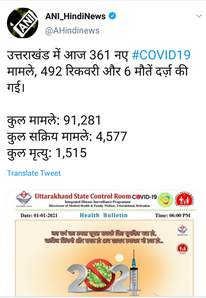 उत्तराखंडात नवीन वर्षाच्या पहिल्याच दिवशी 361 नव्या कोरोना रुग्णांची नोंद झाली. तर 06 जणांनी आपला जीव गमावला आहे. त्यामुळे प्रदेशातील एकूण संख्या 91,281 इतकी आहे. सद्य स्थितीत 4,577 रुग्णांवर उपचार सुरू आहेत.