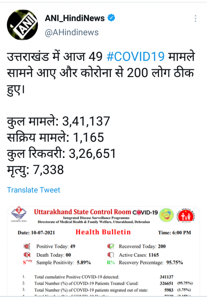 उत्तराखंडात मागील काही दिवसांपासून रुग्ण संख्येत मोठ्या प्रमाणात घट पाहायला मिळत आहे. मागील 24 तासात 49 नवीन कोरोना रुग्ण आढळून आले. यासोबत दिलासादायक बाब म्हणजे एकही रुग्णांचा मृत्यू झाला नाही आहे. तर कालच्या दिवसात 200 रुग्णांना डिस्चार्ज देण्यात आला.