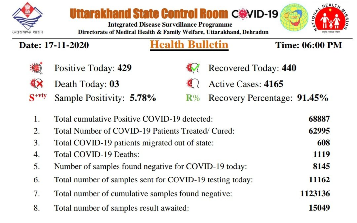 आरोग्य विभागाकडून देण्यात आलेल्या माहितीनुसार, मंगळवारी 8, 145 नमुने निगेटिव्ह आले आहेत. तर देहरादून जिल्ह्यात सर्वात जास्त म्हणजेच 142 रुग्ण आढळून आले. तर रुद्रप्रयाग मध्ये 36, पिथौरागड 35, उत्तरकाशीमध्ये 31, पौंडी 23, अल्मोडा 22, ऊधमसिंह नगर 19, हरिद्वार 18, बागेश्वर 14, चमेली 17, टिहरी 12 आणि चंपावत 8 जणांचा समावेश आहे.
