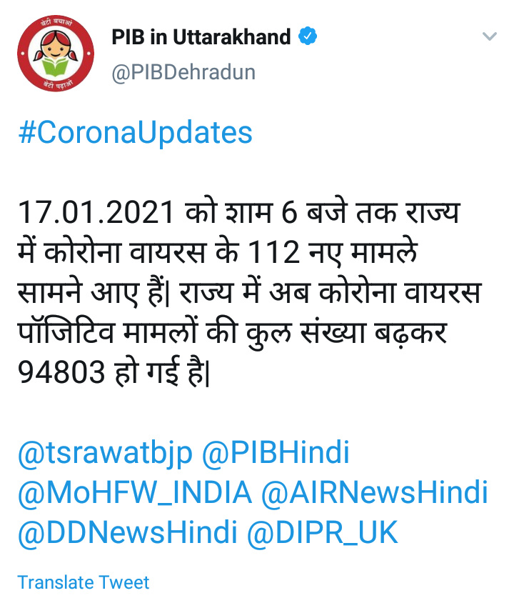 मिळालेल्या माहितीनुसार, काल 8,515 रिपोर्ट निगेटिव्ह आले. काल आढळलेल्या 112 रुग्णांमध्ये अलमोरा जिल्ह्यात 0, बागेश्र्वर 0, चमोली 06, चंपावत 03, देहरादून 59, हरिद्वार 11, नैनिताल 16 पौरी गरवाल 0, पिथोरगड 0, रुद्र प्रयाग 03, तेहरी गरवाल 00, यू एस नगरमधील 13 आणि उत्तर काशीमधील एकाचा समावेश आहे.
