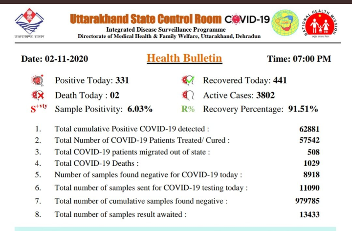 मिळालेल्या माहितीनुसार, काल 8,918 रिपोर्ट निगेटिव्ह आले. काल आढळलेल्या 331 रुग्णांमध्ये अलमोरा जिल्ह्यात 08, बागेश्र्वर 07, चमोली 52, चंपावत 05, देहरादून 84, हरिद्वार 19, नैनिताल 16, पौरी गरवाल 29, पिथोरगड 19, रुद्र प्रयाग 53,तेहरी गरवाल 14, यू एस नगरमधील 17 आणि उत्तर काशीमधील 08 जणांचा समावेश आहे.