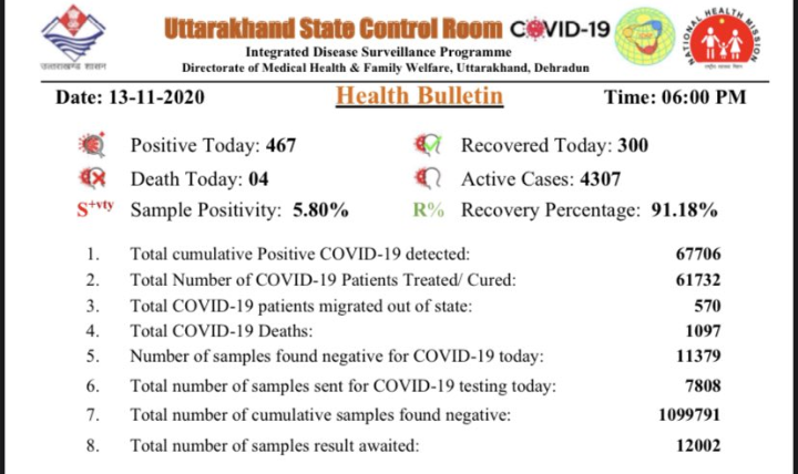 उत्तराखंडात मागील 24 तासात 467 नव्या कोरोना रुग्णांची नोंद झाली. त्यामुळे प्रदेशातील एकूण कोरोना रुग्णांची संख्या 67,706 वर पोहोचली आहे.