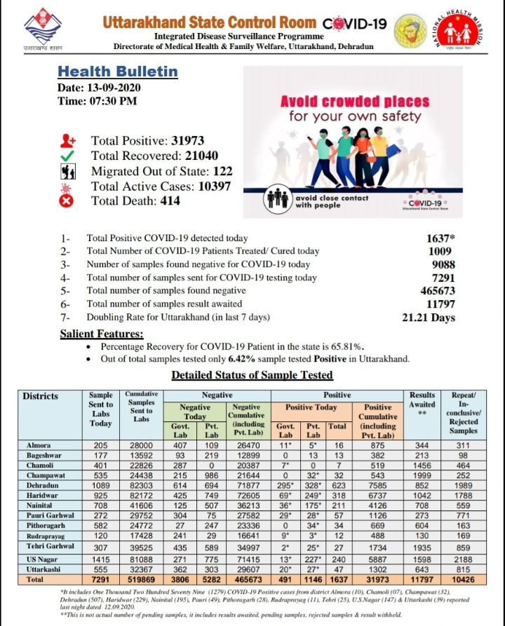मिळालेल्या माहितीनुसार, काल 9,088 रिपोर्ट निगेटिव्ह आले. काल आढळलेल्या 1,637 रुग्णांमध्ये अलमोरा जिल्ह्यात 16, बागेश्र्वर 13, चमोली 07, चंपावत 32, देहरादून 623, हरिद्वार 318, नैनिताल 211, पौरी गरवाल 57, पिथोरगड 34, रुद्र प्रयाग 12,तेहरी गरवाल 27, यू एस नगरमधील 240 आणि उत्तर काशीमधील 47 जणांचा समावेश आहे.