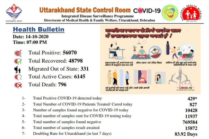 मिळालेल्या माहितीनुसार, काल 10,428 रिपोर्ट निगेटिव्ह आले. काल आढळलेल्या 429 रुग्णांमध्ये अलमोरा जिल्ह्यात 17, बागेश्र्वर 09, चमोली 12, चंपावत 22, देहरादून 157, हरिद्वार 55, नैनिताल 42, पौरी गरवाल 22, पिथोरगड 24, रुद्र प्रयाग 12,तेहरी गरवाल 03, यू एस नगरमधील 40 आणि उत्तर काशीमधील 14 जणांचा समावेश आहे.