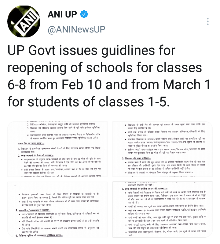 प्रदेशात इयत्ता सहावी ते आठवीच्या शाळा 10 फेब्रुवारी तर इयत्ता पहिली ते पाचवीच्या शाळा 1 मार्च पासून सुरू होणार आहेत. बेसिक शिक्षण डायरेक्टरने उत्तर प्रदेशातील शाळा सुरू करण्यासाठी सविस्तर मार्गदर्शक सूचना जारी केल्या आहे.