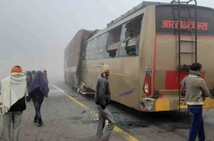 उन्नावमधील आग्रा लखनऊ एक्सप्रेस वेवर औरास भागातील मैनिभावा गावात दाट धुके असल्याने रस्त्यात उभा असलेल्या कंटेनर ला एका डबल डेकर बसने मागून येऊन जोराची धडक दिली. ही धडक एवढी मोठी होती की, बसमधून चाललेल्या 4 प्रवाशांचा जागीच मृत्यू झाला. तर 3 प्रवासी गंभीररित्या जखमी झाले आहेत.