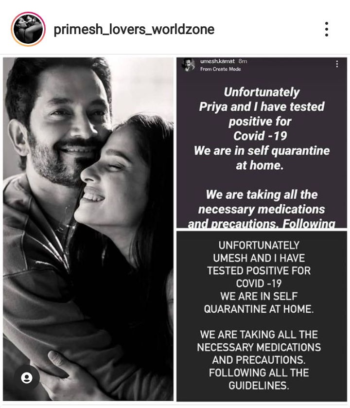 तो आपल्या पोस्टमध्ये म्हणाला की, ‘दुर्दैवाने माझी आणि प्रियाची कोरोना चाचणी पॉझिटीव्ह आली आहे. सध्या आम्ही घरात सेल्फ क्वारंटाईन आहोत. आवश्यक ती औषधे घेत आहोत आणि सावधगिरी देखील बाळगत आहोत. सगळ्या नियमांचेही पालन करत आहोत. मागील आठवड्यात जे कुणीही आमच्या संपर्कात आले असतील, त्यांनी देखील कोव्हिड चाचणी करुन घ्यावी किंवा स्वत:ला आयसोलेट करावे.’ असे आवाहन देखील केले आहे.