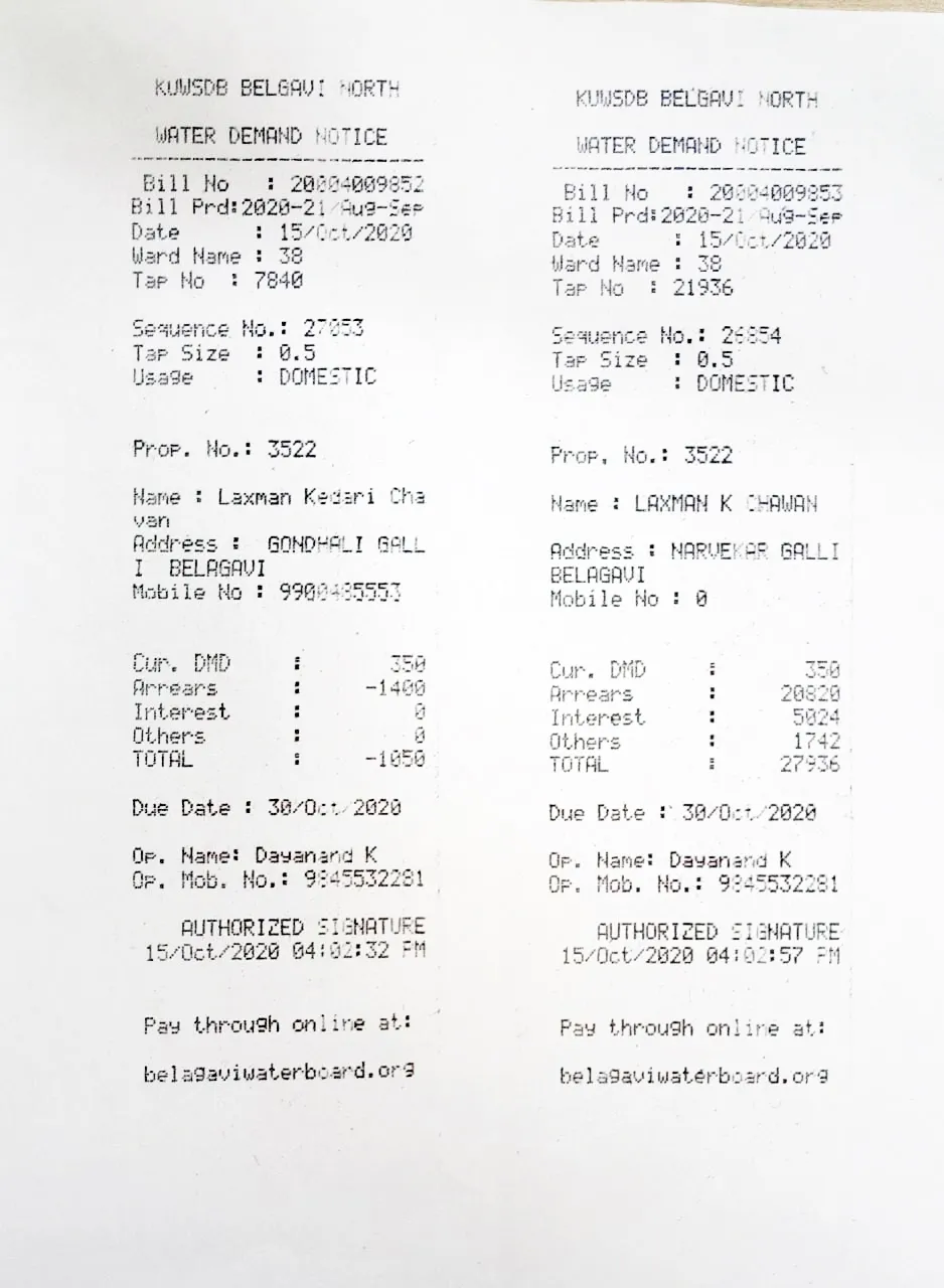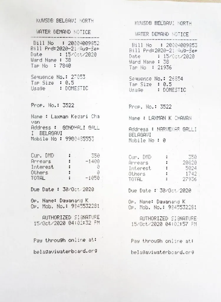 वास्तविक, शहरातील नागरिकांकडे एकच नळ जोडणी आहे. मात्र, त्यांना दोन बिले देण्यात येत आहेत. त्यापैकी काही नागरिकांनी एक बिल नियमितपणे भरले आहे. दुसरे बिल भरले नसल्याने थकीत असल्याचे पाणीपुरवठा मंडळाकडून सांगण्यात येते. गोंधळी गल्ली येथील विनय चव्हाण यांना अशाचप्रकारे दोन बिले देण्यात आली. विनय यांच्या आजोबाच्या नावे नळ जोडणी असल्याने त्यांनी चौकशी केली. विनय नाथाजी चव्हाण यांनी पाणीपुरवठा मंडळाकडे अर्ज करून एकच नळ जोडणी असताना दोन बिले येत असल्याची तक्रार केली. दोन बिले कशी दिली जातात याची माहिती द्यावी, अशी मागणी करून नियमित भरलेल्या नळ बिलाच्या पावत्या पाणीपुरवठा मंडळाकडे सादर केल्या होत्या. तरीदेखील दोन बिले देण्याचा प्रकार सुरूच आहे. 30 ऑक्टोबर रोजी एकाच नळ जोडणीची दोन बिले देण्यात आली. एका बिलाची रक्कम नियमितपणे भरल्याने थकबाकी नसल्याचे दिसून आले. दुसऱया बिलामध्ये दि. 30 ऑक्टोबर 2020 पर्यंत 27 हजार 936 रुपये थकबाकी असल्याची नोंद होती.