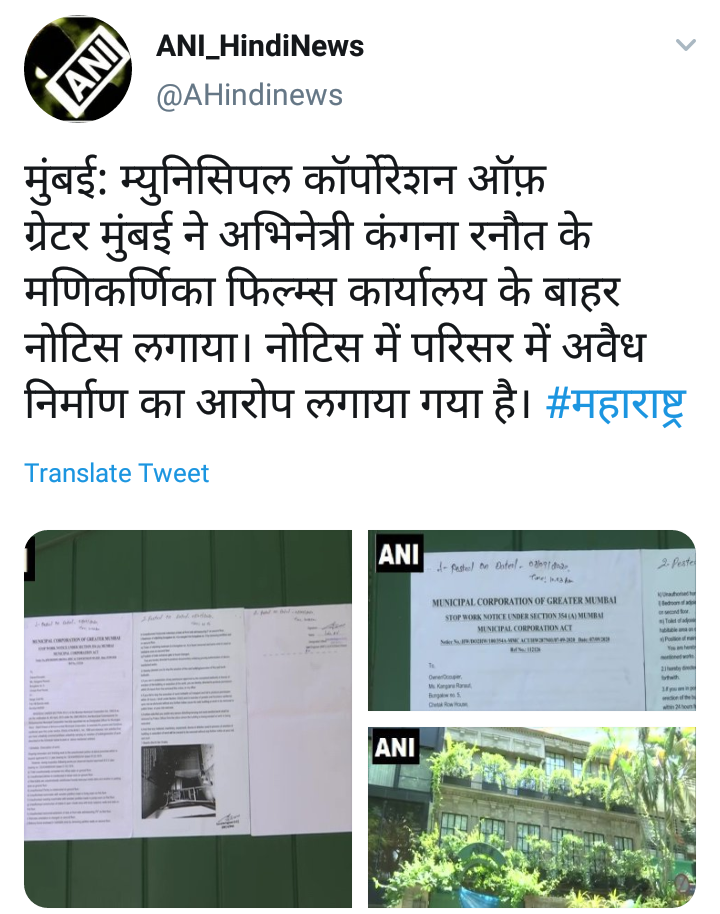 मुंबई महापालिकेने या नोटिसमध्ये लिहिले आहे की, कंगना रनौतचे हे ऑफिस मुंबई महानगरपालिकेच्या नियम 354 अ नुसार नाही. तसेच हे अनधिकृत बांधकाम स्वतः काढून टाका नाही तर पालिका हे बांधकाम तोडणार, असेही या नोटीसमधून सांगण्यात आलं आहे.