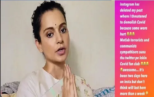कोरोनाने देशात थैमान घातले असताना कंगनाने कोरोनाबातीत केलेल्या पोस्टवर सोशल मीडियावर मोठी टीका झाली होती. अनेकांनी तिला याचा जाब विचारला होता. अखेर कंगनाची ती पोस्ट इन्स्टाग्रामने डिलिट केली आहे. यानंतर पुन्हा कंगनाने इन्स्टाग्रामवर एक वादग्रस्त पोस्ट केली आहे. यात तिने म्हटले आहे की, इन्स्टाग्रामने माझी पोस्ट डिलिट केली आहे. मी त्यात कोरोनाला नष्ट करण्याविषयी बोलले होते. यातून काही जणांच्या भावना दुखावल्या गेल्या. ट्विटरवर दहशतवादी आणि कम्युनिस्टांचे पाठीराखे असतात हे माहिती होते परंतु, कोरोना फॅन क्लब. हे खूपच भारी आहे. मी दोन दिवस झाले इन्स्टावर आले आहे. परंतु, येथे मी आठवडाभरापेक्षा जास्त काही काळ टिकण्याची शक्यता कमी असल्याचे तिने म्हटले आहे.