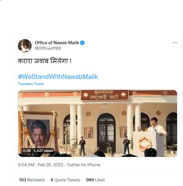 दरम्यान नवाब मलिक यांची प्रकृती खालवल्याने त्यांना जे.जे. रुग्णालयात तपासणीसाठी घेऊन गेले. यावेळी त्यांना रुग्णालयात जास्त वेळ ठेवण्यात आलं होतं. यानंतर मलिकांनी पुन्हा एकदा ट्वीट केलं आहे. मालिकांनी अभिनेता मनोज बाजपेयीचा व्हिडीओ शेअर केला आहे. करारा जवाब मिलेगा ! असं कॅप्शन देत हा व्हिडीओ ट्वीट केला आहे.