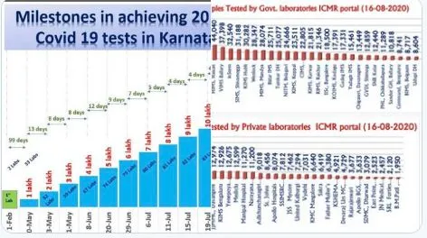 कर्नाटक सरकारने मंगळवारी २० लाखांहून अधिक कोरोनाच्या चाचण्या केल्याचे म्हंटले आहे. आयसीएमआरच्या आकडेवारीनुसार आरोग्य व कुटुंब कल्याण विभागाने या चाचण्या २३ मार्च ते १६ ऑगस्ट दरम्यान घेतल्या असल्याचे म्हंटले आहे. यासह, कर्नाटक देखील जास्तीत जास्त चाचण्या घेणार्या पहिल्या राज्यांपैकी एक आहे.