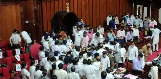 कर्नाटक विधानपरिषदेच्या सदस्यांनी मंगळवारी एकमेकांना धक्काबुक्की केली. यावेळी सभागृहात जदसचे उपाध्यक्ष धर्मेगौडा यांनी अध्यक्ष पदाची सूत्रे हाती घेतल्याने त्यांना खुर्चीवरून बाजूला करण्यावरून चांगलाच गोंधळ झाला. यावेळी काँग्रेस सदस्यांनी धर्मेगौडा यांना खुर्चीवरून बाजूला केलं. दरम्यान सभागृह योग्य नसताना भाजप आणि जेडीएसने उपाध्यक्षांना बेकायदेशीरपणे अध्यक्षांच्या खुर्चीवर बसवले. कॉंग्रेसने अध्यक्षांना खुर्चीवरुन खाली येण्यास सांगितले. ही बेकायदेशीर बैठक असल्याने आम्हाला अध्यक्षांना खुर्चीवरून बाजूला करावे लागेल असे कॉंग्रेसचे एमएलसी प्रकाश राठोड यांनी म्हंटले. दरम्यान अध्यक्ष के. प्रतापचंद्र शेट्टी (कॉंग्रेस) येण्यापूर्वी जद (एस) चे उपाध्यक्ष एस. एल धर्मेगौडा यांनी अध्यक्षपदाची सूत्रे हाती घेतली तेव्हा काँग्रेस सदस्य आक्रमक झाले. धर्मेगौडा यांनी शेट्टी यांच्याविरोधातील अविश्वास ठराव मंजूर केला असता, यामुळे यामुळे कॉंग्रेस सदस्य चँगलेच संतापले. जद (एस) च्या मदतीने भाजपला अविश्वास ठरावाच्या माध्यमातून शेट्टी यांची हकालपट्टी करायची होती. त्यामुळे कॉंग्रेसच्या एमएलसींनी धर्मेगौडा यांना खुर्चीवरून बाजूला खेचून आणले,यावेळी भाजपानेही त्यांना रोखण्याचा प्रयत्न केला. भांडणात, एमएलसीमध्ये हाणामारी झाली. यावेळी घोषणाबाजी करण्यात आली आणि कागदपत्रे फाडण्यात आली. एमएलसी खूपच संतापल्यामुळे कौन्सिल मार्शल फार काही करू शकले नाही. धर्मेगौडा यांना खुर्चीवरून शारिरिकरित्या खुर्चीवरून बाजूला केल्यानंतर कॉंग्रेसचे चंद्रशेखर पाटील यांनी पक्षाच्या एमएलसीच्या स्थायी गार्डसमवेत हा कब्जा केला. भाजपच्या एमएलसींनी विरोध केला तसाच शेट्टी यांनीही हा कब्जा घ्यावा अशी त्यांची इच्छा होती. कॉंग्रेसचे विरोधी पक्षनेते एस. आर. पाटील यांनी धर्मेगौडा हे नियमांच्या विरोधात खुचीर्चीवर बसले आहेत. परवानगीशिवाय ते अध्यक्षांच्या खुर्चीवर कसे बसू शकतात? तसेच अध्यक्षांनी भाजपचा अविश्वास ठराव योग्य नसल्याचे सांगत नाकारले होते, असे ते म्हणाले राज्य सरकारच्या दबावाखाली मंगळवारचे अधिवेशन आयोजित करण्यात आले होते. शेट्टी यांनी १० डिसेंबर रोजी अधिवेशनाचे निलंबन तहकूब केले होते, त्यानंतर भाजपने राज्यपालांकडे याचिका केली होती. सभापतींनी यावर चर्चा करण्यास परवानगी देऊ असे म्हटले पाहिजे. हे आधीही तहकूब केले आहे. मी या वर्तनाचा निषेध करतो. अधिवेशन पुन्हा बोलावण्याच्या दिशानिर्देशांसाठी आम्ही राज्यपालांना भेटू. आमचा लढा सुरूच राहील, असे महसूलमंत्री आर. अशोक म्हणाले.