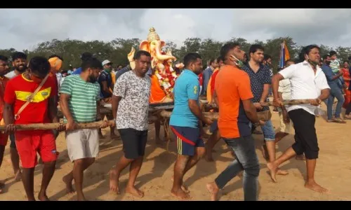 कळंगूट येथील श्री शांतादुर्गा देवस्थानात पुजण्यात आलेल्या 11 दिवशीय सार्वजनिक गणपतीचे विसर्जन अनंत चतुर्थी दिवशी कळंगूट येथील समुद्रात मोठय़ा उत्साहाने भक्त मंडळीतर्फे करण्यात आले. सायं. 3 वा. पारंपरिक गाऱहाणे व आरत्या होऊन श्रीची मूर्ती विसर्जनासाठी बाहेर काढण्यात आली. यंदा कोणताही गाजावाजा न करता साध्या पद्धतीने सोशल डिस्टन्सी सांभाळून भक्ती भावाने श्रीची मूर्ती कळंगूट समुद्रावर नेण्यात आली. तेथे गावचे नागरिक एकनाथ नागवेकर यांनी पारंपरिक गाऱहाणे घातले.