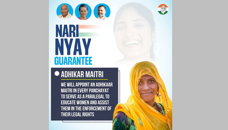 काँग्रेस अध्यक्ष मल्लिकार्जुन खर्गे यांनी ‘नारी न्याय’ हमी अंतर्गत 5 घोषणा केल्या असून त्यात महालक्ष्मी हमी, अर्धी लोकसंख्या-पूर्ण हक्क, महिला शक्ती सन्मान, अधिकार मैत्री, सावित्रीबाई फुले वसतिगृह आदींचा समावेश आहे. महालक्ष्मी हमी योजनेनुसार गरीब कुटुंबातील प्रत्येक महिलेला वार्षिक 1 लाख ऊपयांची मदत दिली जाईल. लोकसभा निवडणुकीपूर्वी काँग्रेसने निम्म्या लोकसंख्येला खूष करण्याचा प्रयत्न केला आहे.