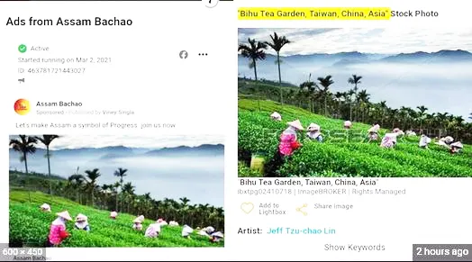 आसामचे मंत्री हिमंता विश्व शर्मा यांनी काँग्रेसच्या जाहिरातीतील छायाचित्रांचा स्क्रीनशॉट काढून तो ट्विट केला आहे. काँग्रेसच्या अधिकृत मोहिमेत चहाच्या मळय़ाचे वापरण्यात आलेले छायाचित्र तैवानचे असल्याचे त्यांनी सांगितले आहे.