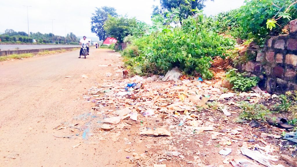 या सर्व्हिस रस्त्यातून मार्गक्रमण करणाऱया टू व्हीलर व फोर व्हीलर गाडय़ांच्या चाकात प्लास्टिक, टाकाऊ वस्तू, हॉटेल, खानावळीतील नासलेले अन्नपदार्थ, भाजीपाल्याचा ओला कचरा यामुळे दुर्गंधी पसरत आहे. यांचा नाहक त्रास मार्गक्रमण करणाऱयांना होत आहे.