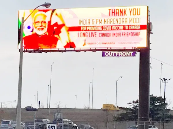 कॅनडाच्या गेटर टोरंटोच्या रस्त्यांवर सध्या पंतप्रधान नरेंद्र मोदींचे होर्डिंग्स दिसून येत आहेत. भारताने कॅनडाला कोरोनावरील लसींचा पुरवठा केला आहे. याचमुळे कॅनडाने पंतप्रधान मोदी आणि भारताचे आभार मानले आहेत. ‘कॅनडाला कोरोनाची लस उपलब्ध करविण्यासाठी भारत आणि नरेंद मोदींचे धन्यवाद’ असे या बिलबोर्डमध्ये नमूद आहे.