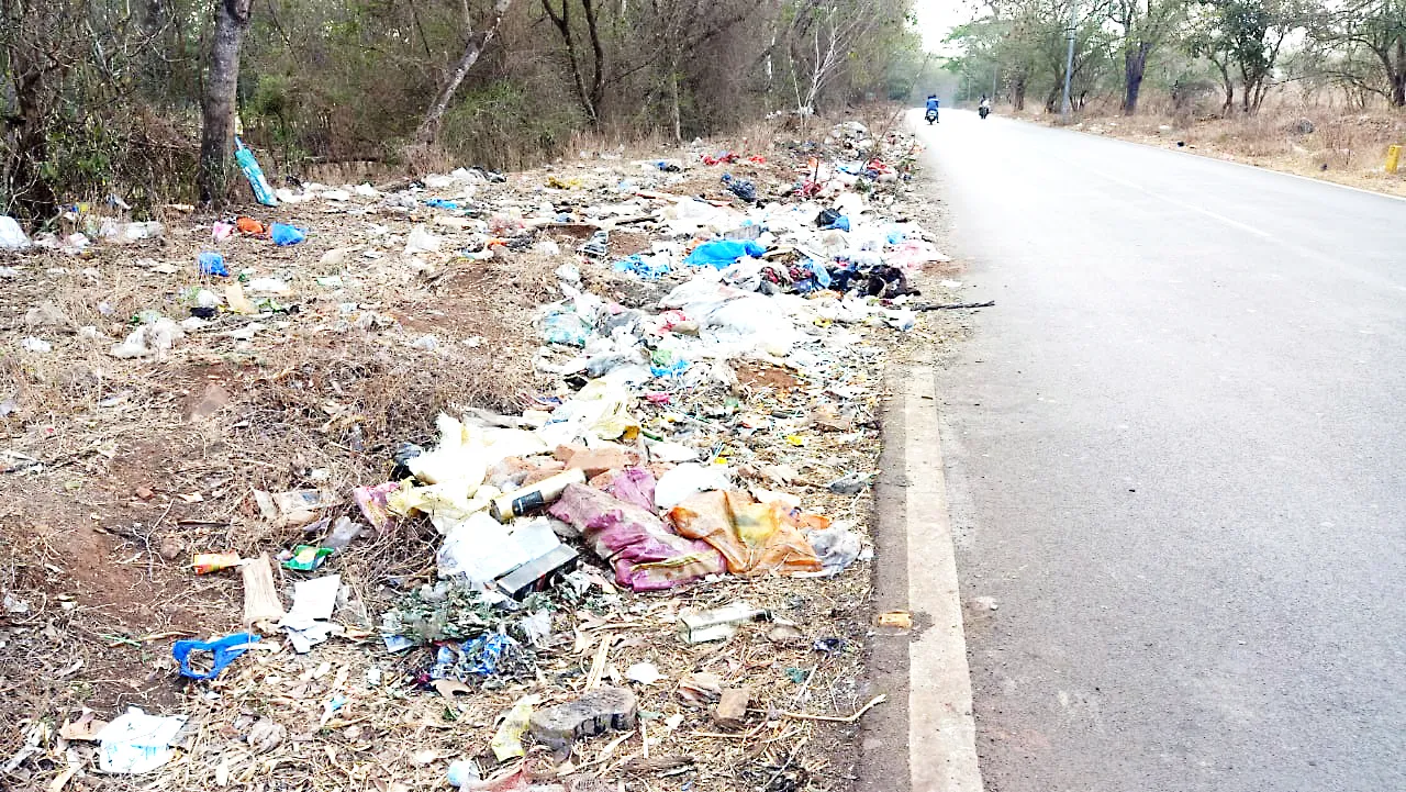 रस्त्याच्या दुतर्फा कचरा टाकण्याचा प्रकार : पर्यावरणपूरक परिसरात कचऱयाचे ढिगारे, स्वच्छतेकडे दुर्लक्ष