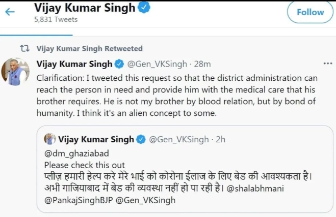 सिंग यांनी ट्विटमध्ये म्हटले आहे की, ‘कृपया आमची मदत करा, माझ्या भावाला कोरोना संसर्ग झालेला असून, त्याला उपचारासाठी बेडची आवश्यकता आहे. गाझियाबादमध्ये बेडची व्यवस्था होत नाही.’ सिंग यांनी हे ट्विट गाझियाबादच्या जिल्हाधिकाऱ्यांसह मुख्यमंत्री योगी आदित्यनाथ यांचे माहिती सल्लागार शलभ त्रिपाठी आणि भाजपचे प्रदेश उपाध्यक्ष पंकज सिंह यांना टॅग केले आहे.
