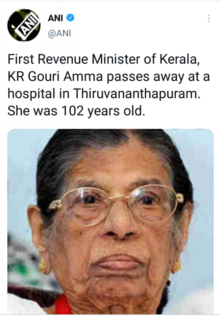 केरळमधील मार्क्सवादी कम्युनिस्ट पक्षाच्या नेत्या आणि 1957 मधील तत्कालीन मुख्यमंत्री के. आर. गौरी यांचे मंगळवारी निधन झाले. वयाच्या 102 व्या वर्षी त्यांनी तिरूवनंतपूरम येथील रुग्णालयात अंतिम श्वास घेतला.