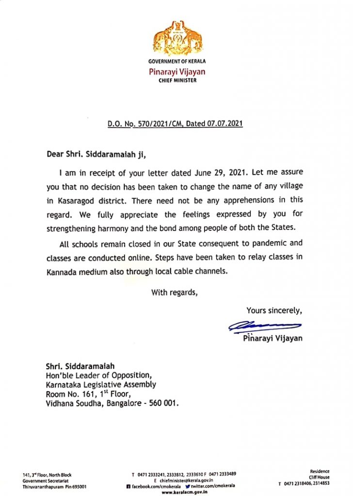केरळचे मुख्यमंत्री पिनराई विजयन यांनी कर्नाटकातील विरोधी पक्षनेते सिद्धरामय्या यांना पत्र लिहून कासारगोड जिल्ह्यातील कोणत्याही गावांची नावे बदलणार नाहीत, असे आश्वासन दिले. केरळ सरकारने स्थानिक केबल वाहिन्यांमार्फत कन्नड मध्यम वर्ग प्रसारित करण्यासाठी पावले उचलली आहेत, अशी माहितीही त्यांनी दिली. तत्पूर्वी सिद्धरामय्या यांनी विजयन यांना पत्र लिहून आपल्या सरकारने कासारगोड जिल्ह्यातील कोणत्याही गावांची नावे बदलू नयेत अशी विनंती केली होती.
