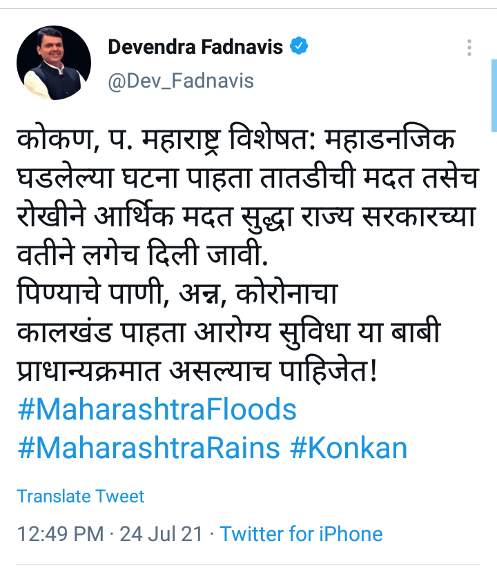 कोकण, प. महाराष्ट्र विशेषत: महाडनजिक घडलेल्या घटना पाहता तातडीची मदत तसेच रोखीने आर्थिक मदत सुद्धा राज्य सरकारच्या वतीने लगेच दिली जावी. पिण्याचे पाणी, अन्न, कोरोनाचा कालखंड पाहता आरोग्य सुविधा या बाबी प्राधान्यक्रमात असल्याच पाहिजेत अशी मागणी विरोधी पक्षनेते देवेंद्र फडणवीस यांनी केली आहे.