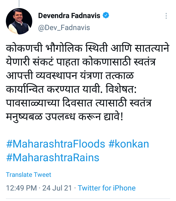 ते पुढे म्हणाले की, कोल्हापूर, सांगली, सातारा, रायगड, रत्नागिरी, ठाणे, पालघर या जिल्ह्यांमध्ये ‘रिस्क असेसमेंट‘ तातडीने करण्यात यावे. कोकणची भौगोलिक स्थिती आणि सातत्याने येणारी संकटे पाहता कोकणासाठी स्वतंत्र आपत्ती व्यवस्थापन यंत्रणा तत्काळ कार्यान्वित करण्यात यावी. विशेषत: पावसाळ्याच्या दिवसात त्यासाठी स्वतंत्र मनुष्यबळ उपलब्ध करून द्यावे असे फडणवीसांनी म्हटले आहे.