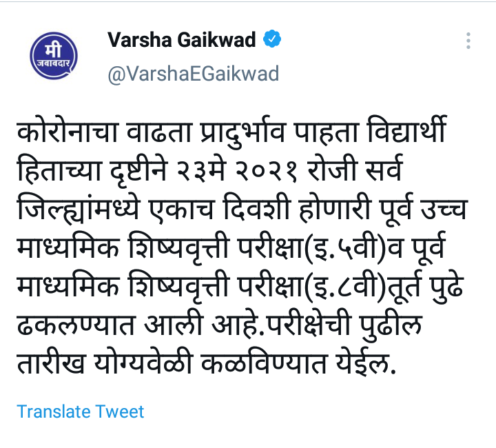 कोरोनाचा वाढता प्रादुर्भाव पाहता विद्यार्थी हिताच्या दृष्टीने २३मे २०२१ रोजी सर्व जिल्ह्यांमध्ये एकाच दिवशी होणारी पूर्व उच्च माध्यमिक शिष्यवृत्ती परीक्षा(इ.५वी)व पूर्व माध्यमिक शिष्यवृत्ती परीक्षा(इ.८वी)तूर्त पुढे ढकलण्यात आली आहे.परीक्षेची पुढील तारीख योग्यवेळी कळविण्यात येईल, असे ट्विट वर्षा गायकवाड यांनी केले आहे.