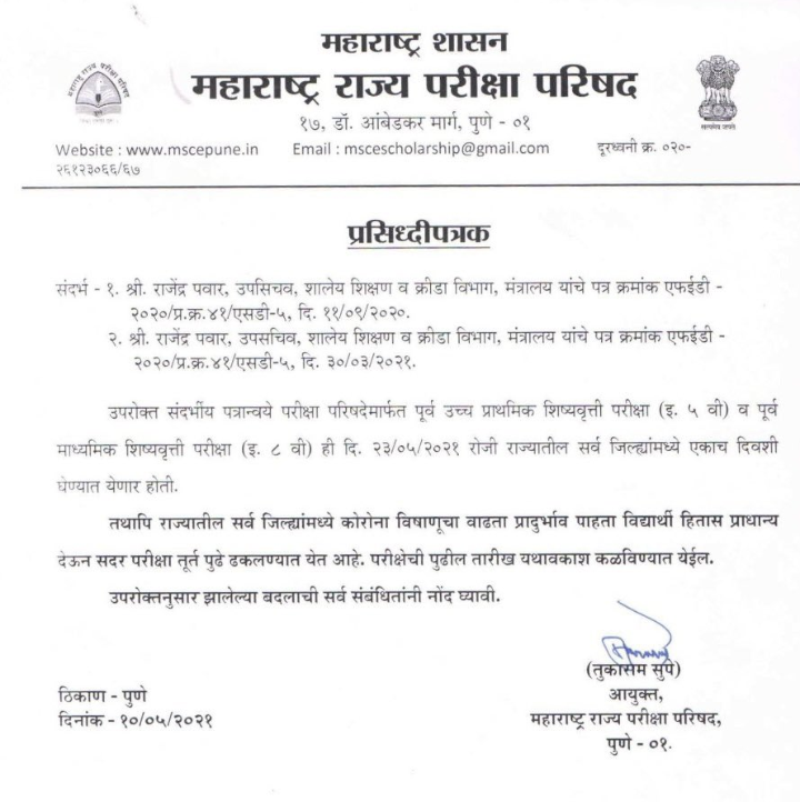 राज्य परीक्षा परिषदेने याबाबत प्रसिद्धीपत्रक जारी केले आहे. यापूर्वी 25 एप्रिल रोजी होणारी परीक्षा कोरोना विषाणू संसर्गामुळे 23 मे रोजी घेण्याचा निर्णय घेण्यात आला होता. महाराष्ट्र राज्य परीक्षा परिषदेच्या वतीने दरवर्षी फेब्रुवारी महिन्यात शिष्यवृत्ती परीक्षेचे आयोजन केले जाते. मात्र, कोरोनामुळे परीक्षा पुढे ढकलली होती.