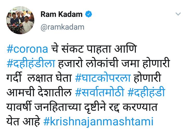 राम कदम यांनी आपल्या ट्विट मध्ये म्हटले की, कोरोनाचे संकट पाहता आणि दहीहंडीला हजारो लोकांची जमा होणारी गर्दी लक्षात घेता घाटकोपरला होणारी आमची देशातील सर्वात मोठी दहीहंडी यावर्षी जनहिताच्या दृष्टीने रद्द करण्यात येत आहे.
