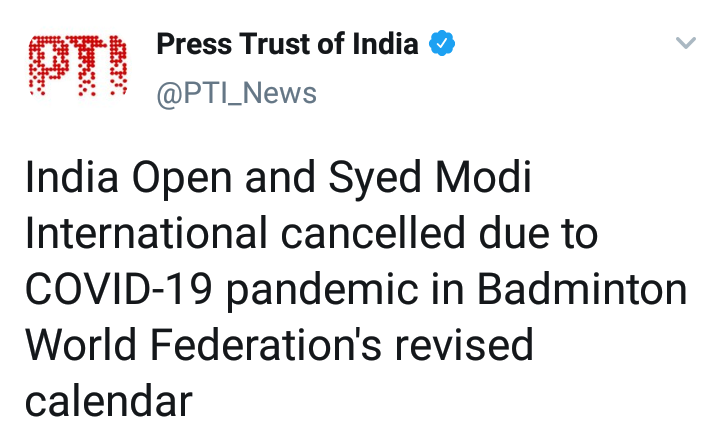 कोरोना महामारीच्या संकटामुळे गुरुवारी इंडिया ओपन आणि सैयद मोदी इंटरनॅशनल टूर्नामेंट रद्द करण्यात आली. बॅडमिंटन वर्ल्ड फेडरेशनच्या ठरलेल्या वेळापत्रकानुसार होणार असलेल्या या दोन्ही टूर्नामेंट रद्द करण्यात आले आहेत.
