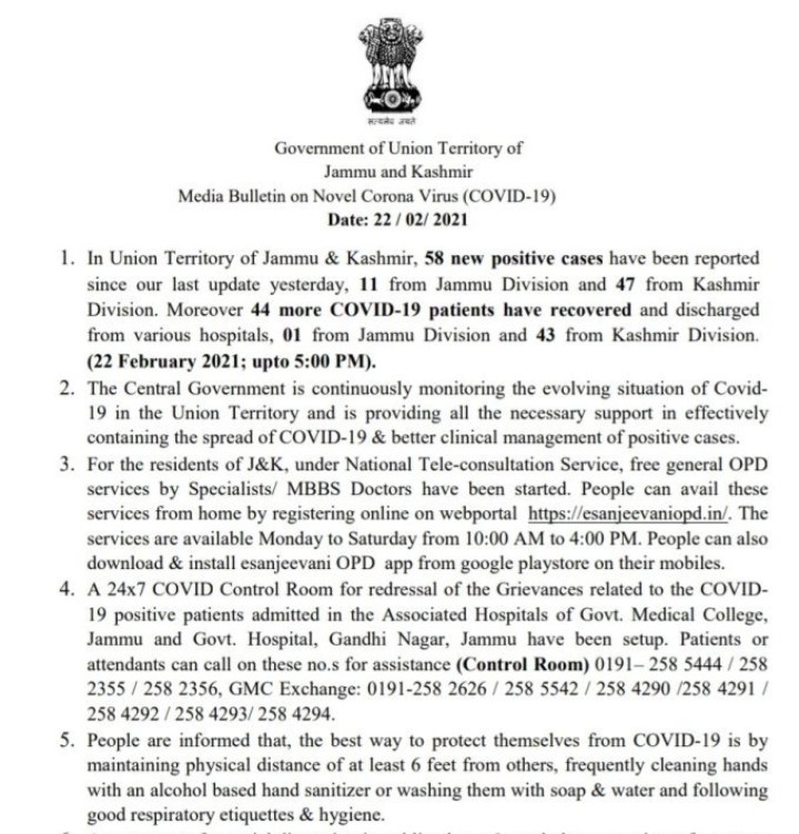 मिळालेल्या माहितीनुसार, मिळालेल्या नव्या रुग्णांमध्ये जम्मूतील 11 आणि काश्मीर मधील 47 जणांचा समावेश आहे. सद्य स्थितीत 735 रुग्णांवर उपचार सुरू आहेत.